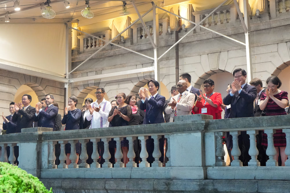 外交部於今(2025)年10月10日晚間在臺北賓館舉辦國慶酒會,由外交部長林佳龍暨夫人主持,除賴清德總統、蕭美琴副總統、國安會秘書長吳釗燮等政府首長親臨現場外,另包括貝里斯總督察芙拉閣下(H.E. Dame Froyla Tzalam)暨夫婿、聖露西亞總督查爾斯閣下(H.E. Sir Cyril Errol Melchiades Charles)伉儷、巴拉圭共和國眾議長拉多雷閣下(H.E. Dr. Raúl Luis Latorre Martínez)等貴賓,以及各國駐台使節代表等,共約45國貴賓齊聚臺北賓館慶祝我國生日。