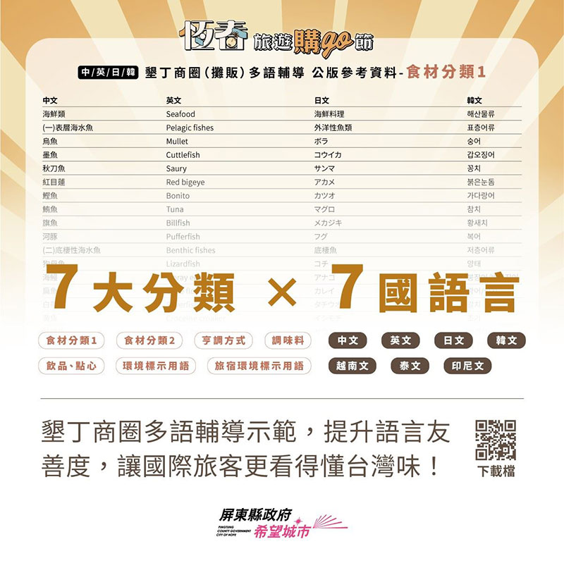 為提升恆春半島國際旅遊友善,屏東縣政府首度系統性推動商圈多語輔導措施,以墾丁商圈為示範商圈,協助餐飲業者優化外語溝通環境,讓國際旅客「看得懂菜單、吃得懂台灣味」,打造更友善的國際旅遊體驗。