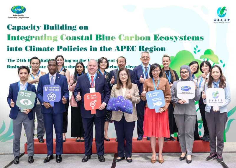 台灣積極展現海洋治理與氣候韌性的領導力,逐漸站上全球舞台。海洋委員會15日在台北辦理「亞太區域氣候政策納入藍碳之能力建構研習營」,匯聚了共40個國家、國際非政府組織、企業、學術及國際認證機構等代表,為亞太區域氣候行動注入新動能。海委會主任委員管碧玲於開幕致詞時表示,「讓海洋成為氣候變遷解方!」