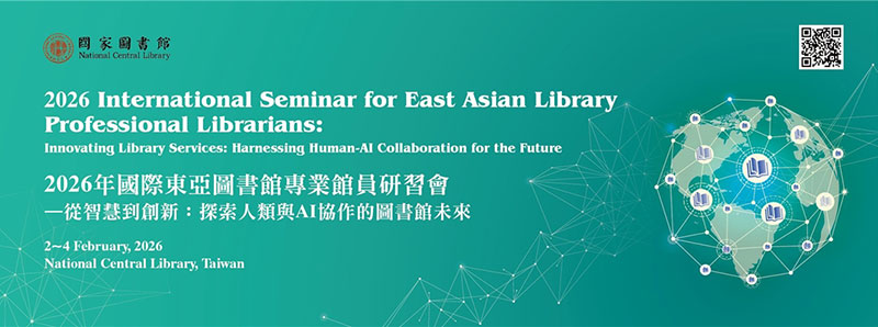 為促進我國圖書館專業與國際接軌,並行銷臺灣學術出版成果,國家圖書館將於2026年2月2日至4日舉辦「2026年國際東亞圖書館專業館員研習會」(2026 International Seminar for East Asian Library Professional Librarians)。本次研習會的主題聚焦於「人類與人工智慧協作」,邀請來自美國、英國、加拿大、日本、澳洲、瑞士、香港、菲律賓、泰國等9國的20位國際圖書館專業館員,以及國圖在海外締結的TRCCS夥伴成員館,共同齊聚臺北,開展為期三天的專業研習與交流。除了五場專題講座,與會學員還將參訪台北國際書展及國家檔案館,進一步加深對臺灣出版與文化典藏的了解。