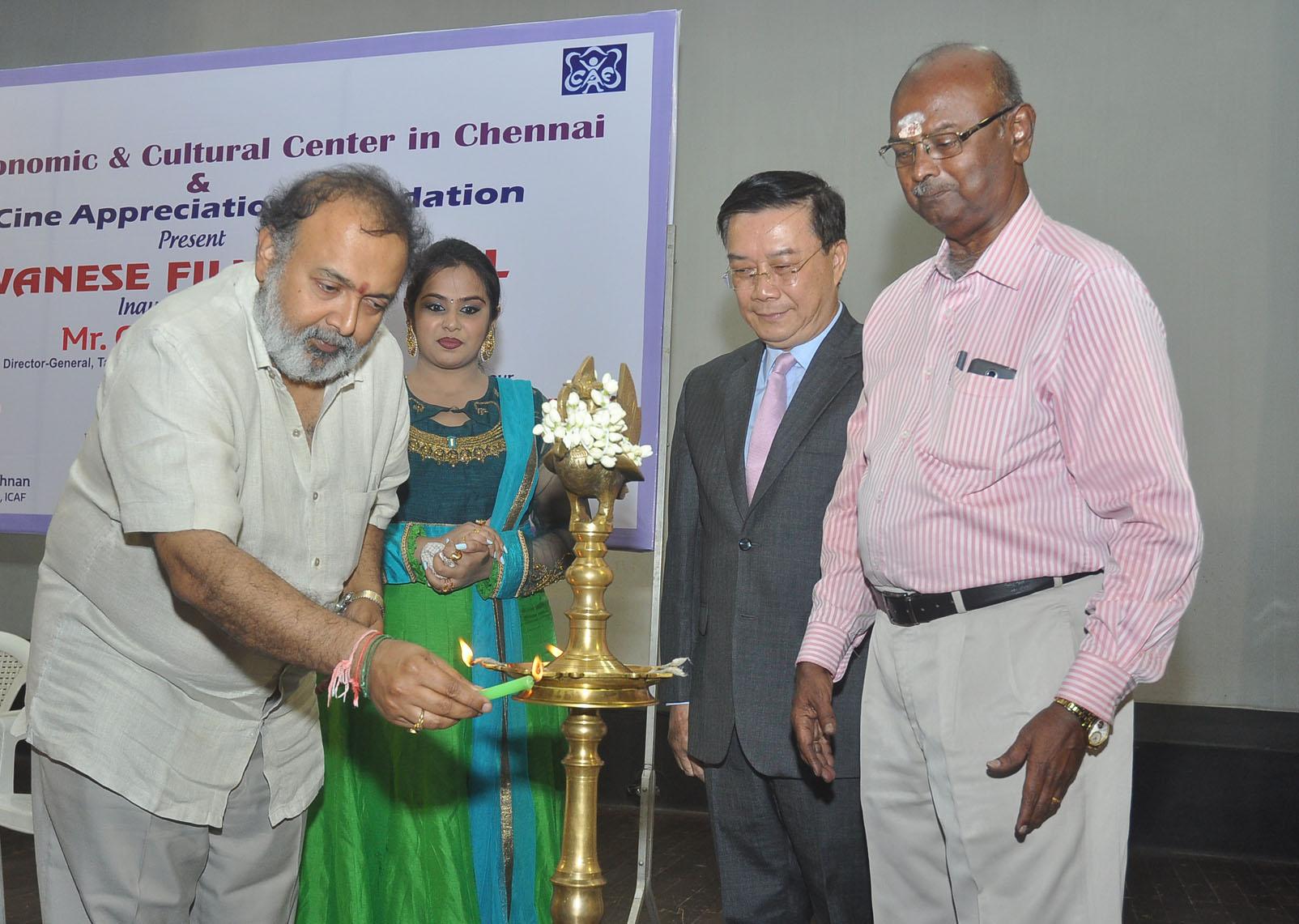 駐清奈辦事處與清奈「印度電影欣賞基金會」(Indo Cine Appreciation Foundation)7月31日傍晚在清奈「俄羅斯文化中心」(Russian Center of Science and Culture)舉行2017年臺灣藝術週第二階段的「臺灣電影節」活動開幕點燈儀式,本處李朝成處長、「南印度電影商會」(South Indian Film Chamber of Commerce)秘書長Ravi Kottarakara、「印度電影欣賞基金會」秘書長E. Thangaraj及電影明星Ms. Sai Preethi共同點燈祈福。