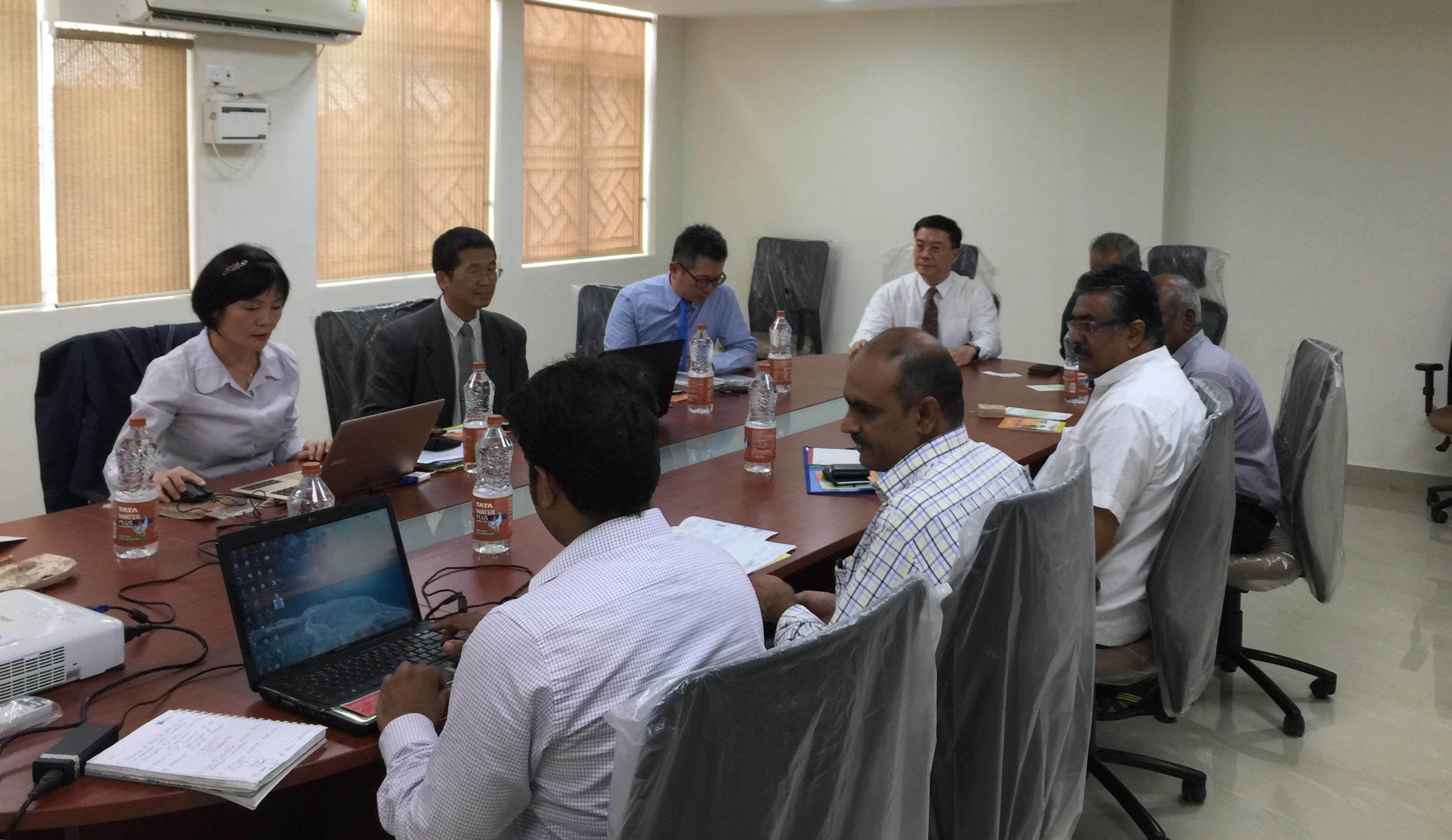 李朝成處長(左四)率中國生產力中心代表團與印度國家生產力委員會(National Productivity Council)安貝卡生產力研究所(Dr. Ambedkar Institute Institute of Productivity)研商兩國共同在印度執行亞洲生產力組織(APO)綠能、儲能及水處理計畫。印度國家生產力委員會清奈地區所長拉朱(右五)。