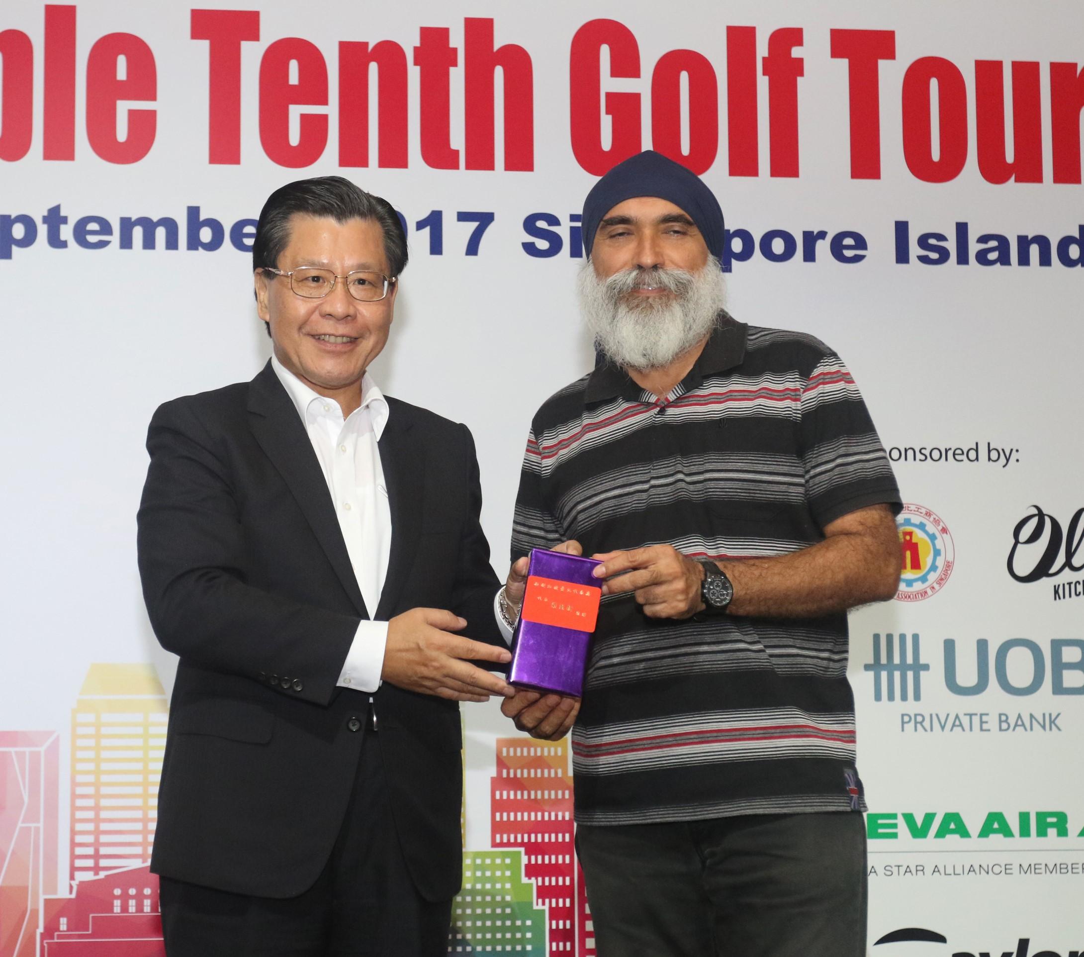 駐新加坡台北代表處梁代表國新應邀出席旅星各界慶祝中華民國106年國慶活動籌委會於本(9)月20日(星期三)舉辦的國慶盃高爾夫球比賽,之後於晚間出席頒獎晚會。包括僑界代表國慶籌委會主任委員暨新加坡台北工商協會會長陳正旻夫婦、僑務委員陳正吉夫婦、僑務諮詢委員王正彥夫婦及鍾仕達、僑務顧問張嘉升、僑務促進委員張耀夫、錢禎三及許慶育、新加坡金門會館副主席陳篤漢等貴賓,與參賽選手偕眷共150餘人出席晚會。代表處戴副代表輝源及陳組長永乾等同仁亦參賽。