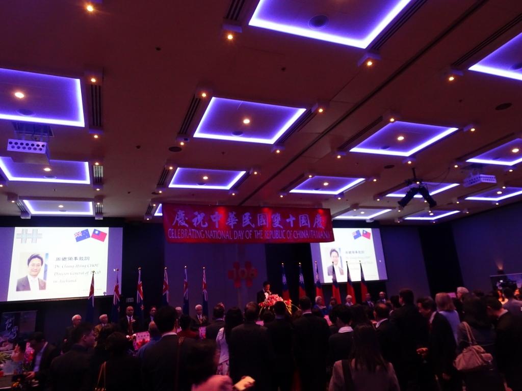 與會紐西蘭政黨領袖、國會議員及地方政府代表等政要亦應邀致辭祝福我國國慶,分別讚譽我民主、經濟、人權及科技發展成就,並肯定台紐簽署經濟合作協定(ANZTEC)有助於擴大兩國經貿合作關係及增進雙方相互瞭解與友誼,另推崇駐奧克蘭台北經濟文化辦事處對於推動兩國間交流所做貢獻。周中興夫婦與貴賓及全體來賓並舉杯祝酒,切國慶蛋糕,祝福我國國運昌隆,將酒會熱鬧氣氛帶入最高潮。