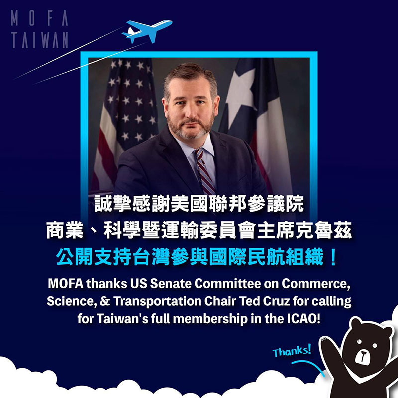 MOFA sincerely thanks US Senator Cruz for publicly supporting Taiwan’s participation in ICAO