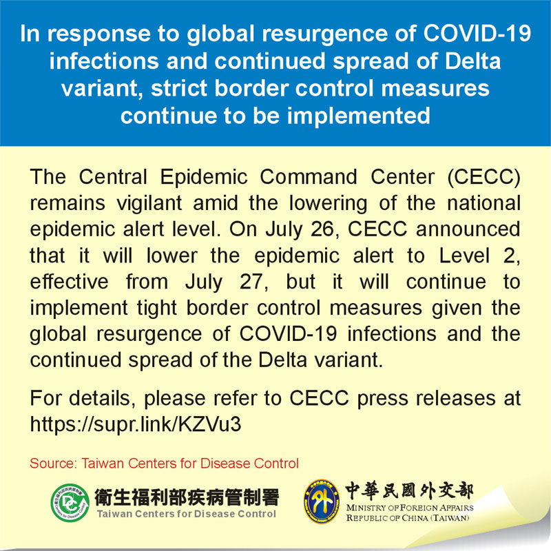 The Central Epidemic Command Center (CECC) announced today that strict border control measures will remain in place after the nationwide epidemic alert is lowered to Level 2 starting July 27. The continued implementation of these measures is based on the resurgence of COVID-19 infections and the ongoing transmission of the Delta variant around the world and reflects Taiwan’s determination to remain vigilant.