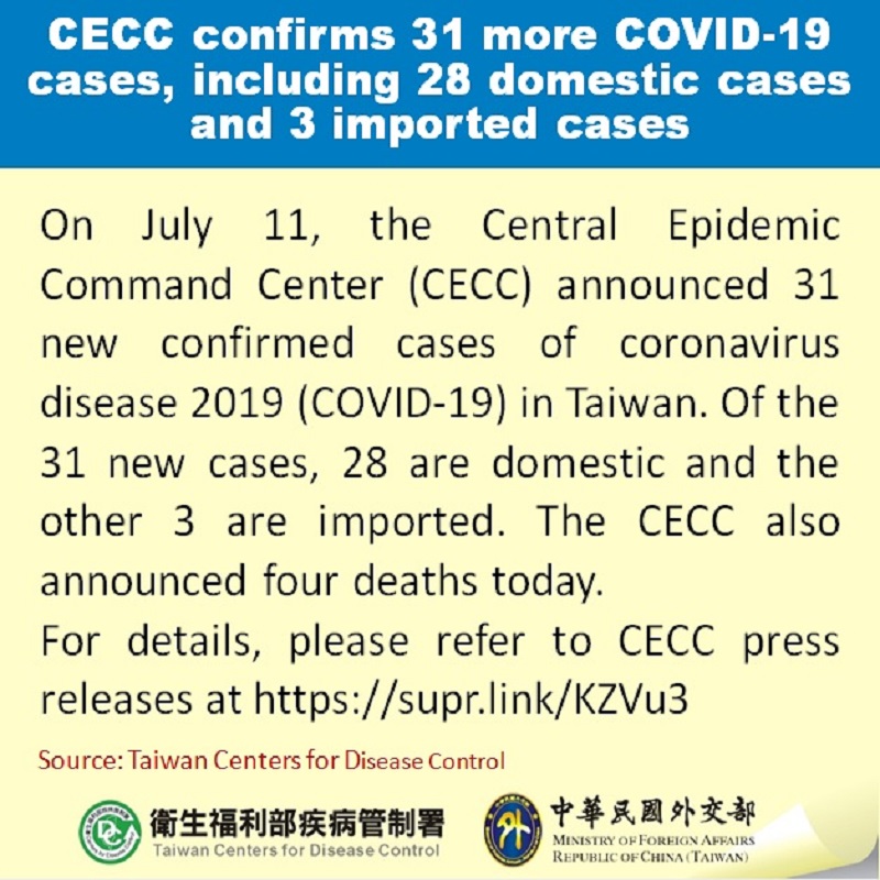 Regarding the one new imported case, Case #15370 is a Croatian girl under the age of 10. She arrived in Taiwan from Switzerland on June 28. She was tested for COVID-19 on July 10 before completing the quarantine period, and infection with COVID-19 was laboratory-confirmed in the case on July 12 (the CT value was 33).