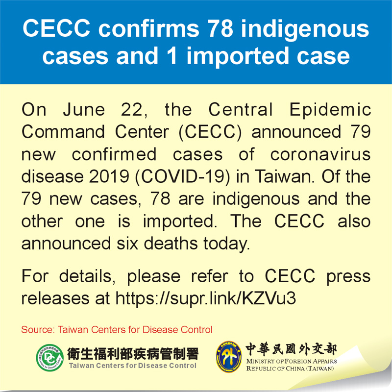 On June 22, the Central Epidemic Command Center announced that to prevent the spread of the Delta variant of COVID-19, starting June 22, close contacts of confirmed COVID-19 cases and travelers entering Taiwan from abroad, whether symptomatic or asymptomatic, will be required to undergo PCR testing one day prior to the end of home isolation or home quarantine period.