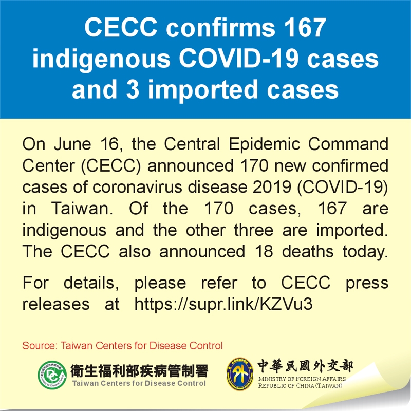 Regarding the three new imported cases, Case #13305 is an over 20-year-old male from Indonesia. Case #13332 and Case #13333 are a Taiwanese female in her 50s and a Taiwanese man under 10, respectively. They both returned to Taiwan from Peru on June 6.