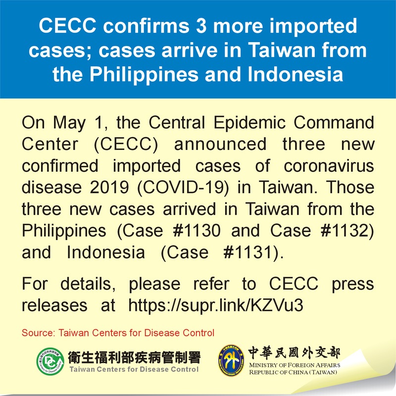 On May 3, the Central Epidemic Command Center (CECC) announced that beginning 00:00 am on May 4 (arrival time), R.O.C. nationals and non-R.O.C. nationals with an Alien Resident Certificate (ARC) who have traveled to India in the past 14 days (those who have transited in India included) would be required to stay at group quarantine facilities and undergo COVID-19 testing after arrival in Taiwan.