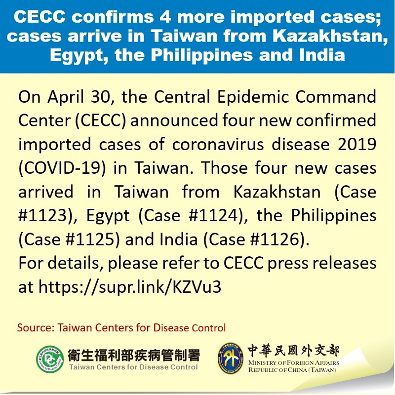 On April 30, the Central Epidemic Command Center (CECC) announced four new confirmed imported cases of coronavirus disease 2019 (COVID-19) in Taiwan. Those four new cases arrived in Taiwan from Kazakhstan (Case #1123), Egypt (Case #1124), the Philippines (Case #1125) and India (Case #1126).