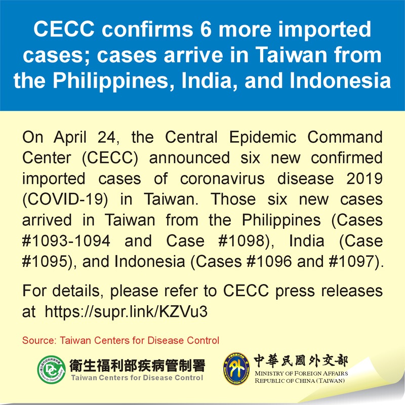 On April 24, the Central Epidemic Command Center (CECC) announced six new confirmed imported cases of coronavirus disease 2019 (COVID-19) in Taiwan. Those six new cases arrived in Taiwan from the Philippines (Cases #1093-1094 and Case #1098), India (Case #1095), and Indonesia (Cases #1096 and #1097).