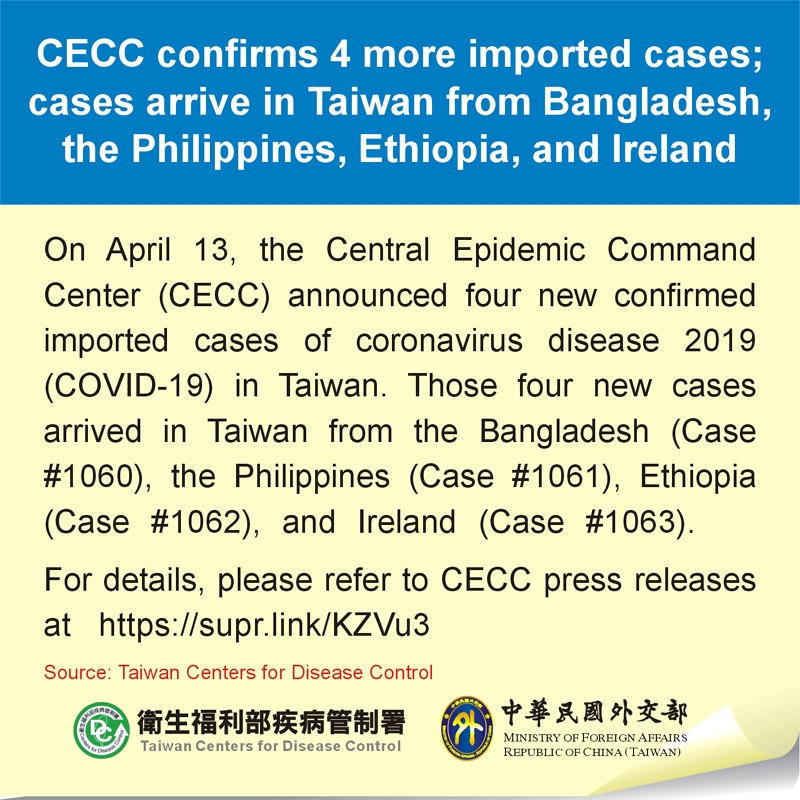 As the COVID-19 pandemic continues to ravage the globe, the Central Epidemic Command Center (CECC) announces that beginning April 14, 2021, the government-funded COVID-19 vaccine is available to individuals in the fourth priority group, i.e., those who must travel abroad due to special circumstances such as diplomatic personnel and other personnel engaging in official business and athletes and competitors representing Taiwan overseas.