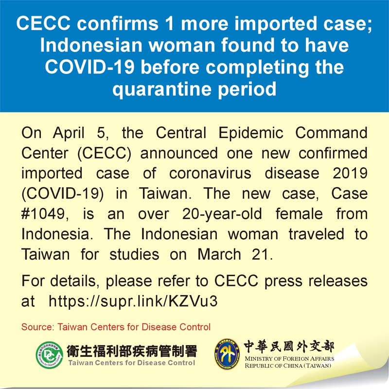 On April 5, the Central Epidemic Command Center (CECC) announced one new confirmed imported case of coronavirus disease 2019 (COVID-19) in Taiwan. The new case, Case #1049, is an over 20-year-old female from Indonesia. The Indonesian woman traveled to Taiwan for studies on March 21. She didn’t experience any symptoms when she arrived in Taiwan. Before completing the quarantine period, she was tested for COVID-19 on April 3; infection with COVID-19 was laboratory-confirmed in the case on April 5.