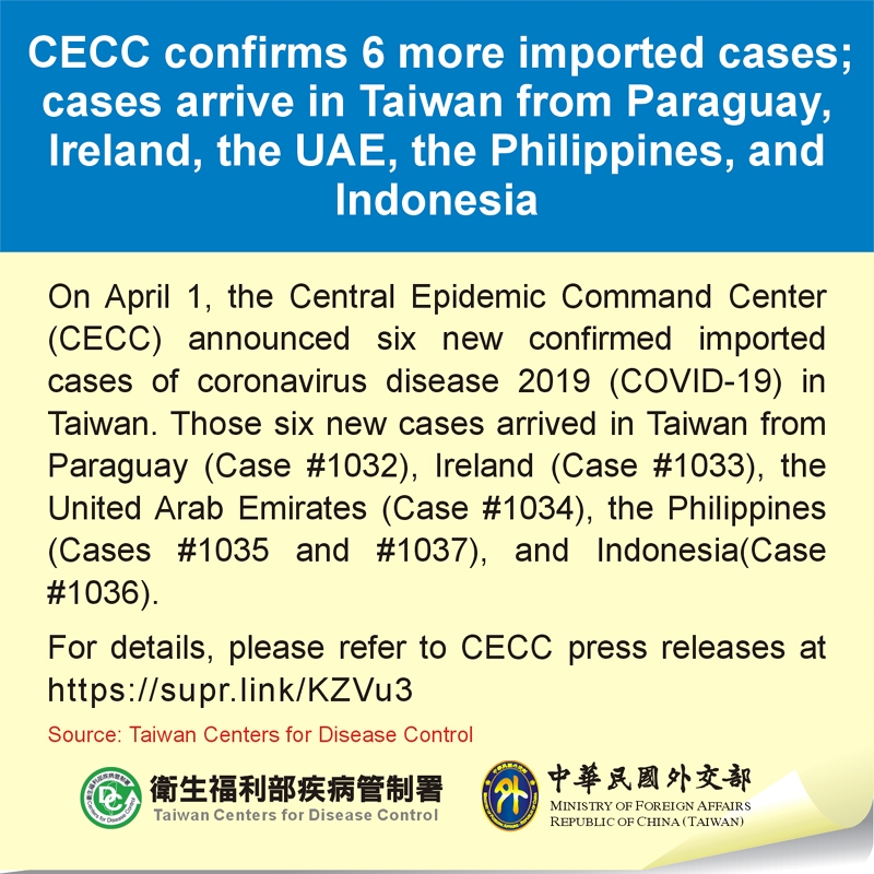 On April 1, the Central Epidemic Command Center (CECC) announced six new confirmed imported cases of coronavirus disease 2019 (COVID-19) in Taiwan. Those six new cases arrived in Taiwan from Paraguay (Case #1032), Ireland (Case #1033), the United Arab Emirates (Case #1034), the Philippines (Cases #1035 and #1037), and Indonesia(Case #1036).
