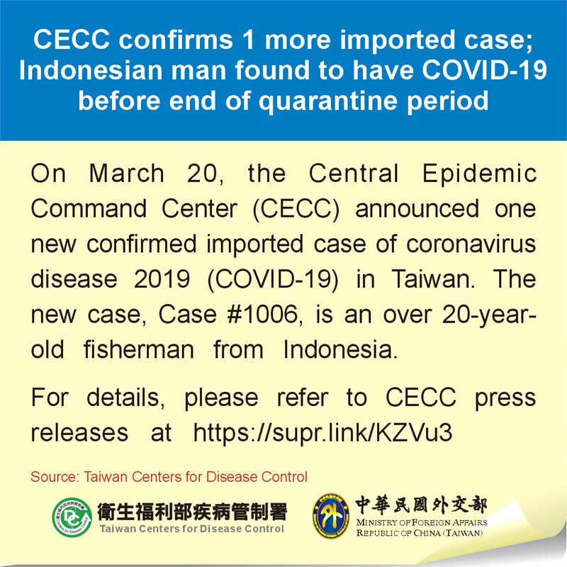 On March 20, the Central Epidemic Command Center (CECC) announced one new confirmed imported case of coronavirus disease 2019 (COVID-19) in Taiwan. The new case, Case #1006, is an over 20-year-old fisherman from Indonesia.