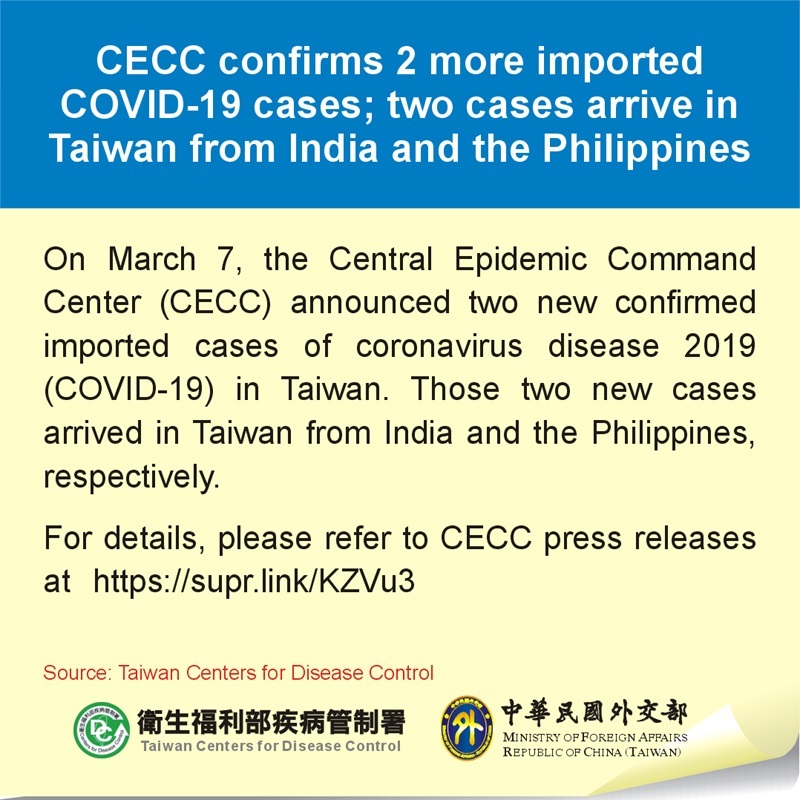 On March 7, the Central Epidemic Command Center (CECC) announced two new confirmed imported cases of coronavirus disease 2019 (COVID-19) in Taiwan. Those two new cases arrived in Taiwan from India and the Philippines, respectively.