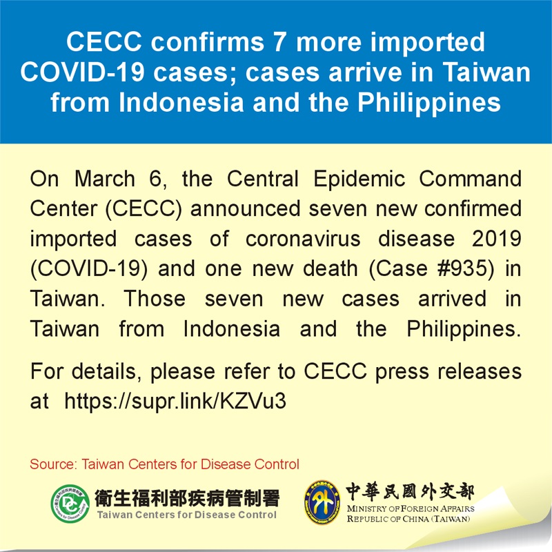 On March 6, the Central Epidemic Command Center (CECC) announced seven new confirmed imported cases of coronavirus disease 2019 (COVID-19) and one new death (Case #935) in Taiwan. Those seven new cases arrived in Taiwan from Indonesia and the Philippines.