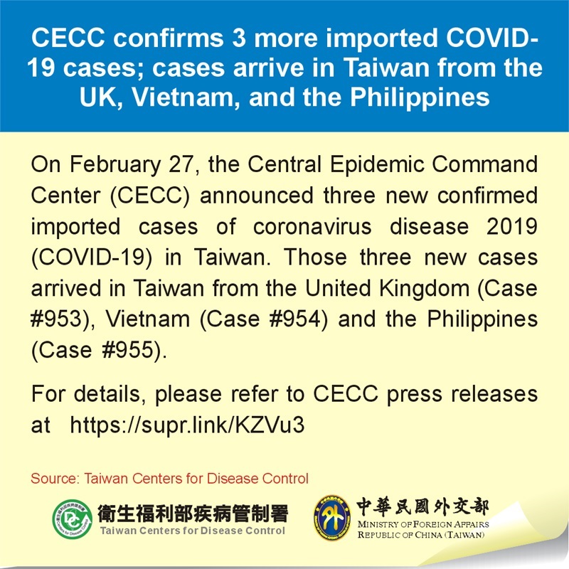 On February 27, the Central Epidemic Command Center (CECC) announced three new confirmed imported cases of coronavirus disease 2019 (COVID-19) in Taiwan. Those three new cases arrived in Taiwan from the United Kingdom (Case #953), Vietnam (Case #954) and the Philippines (Case #955).