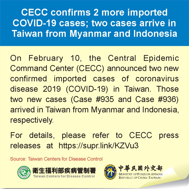 On February 10, the Central Epidemic Command Center (CECC) announced two new confirmed imported cases of coronavirus disease 2019 (COVID-19) in Taiwan. Those two new cases (Case #935 and Case #936) arrived in Taiwan from Myanmar and Indonesia, respectively.