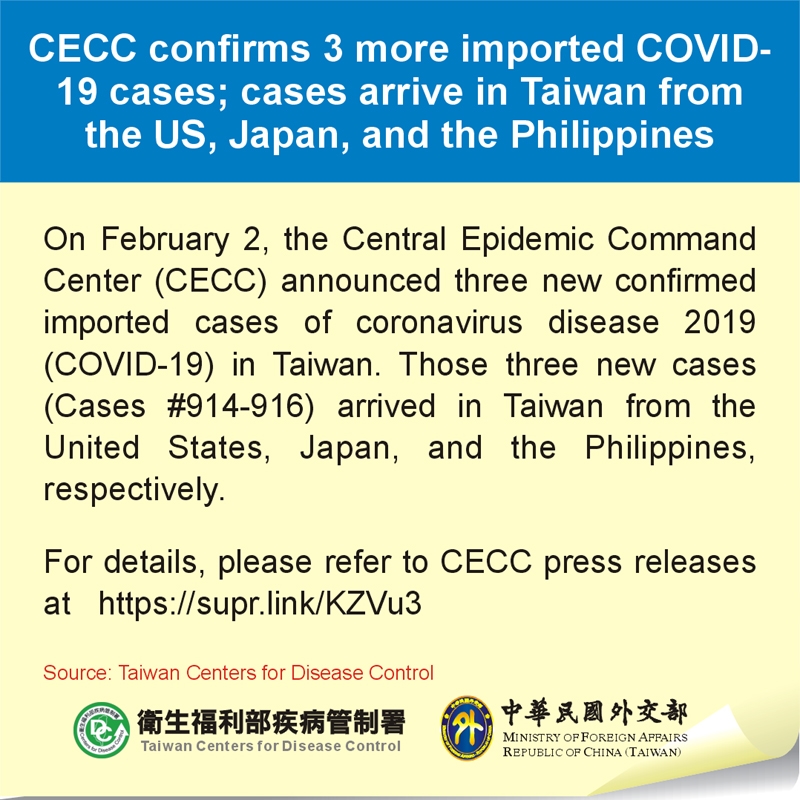 On February 2, the Central Epidemic Command Center (CECC) announced three new confirmed imported cases of coronavirus disease 2019 (COVID-19) in Taiwan. Those three new cases (Cases #914-916) arrived in Taiwan from the United States, Japan, and the Philippines, respectively.
