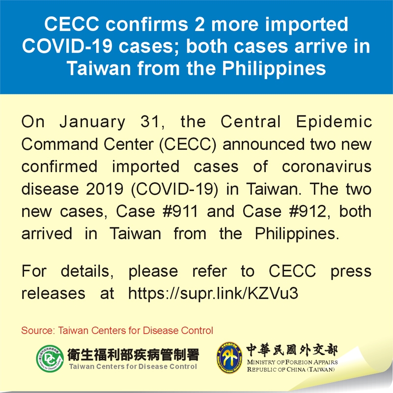 On January 31, the Central Epidemic Command Center (CECC) announced two new confirmed imported cases of coronavirus disease 2019 (COVID-19) in Taiwan. The two new cases, Case #911 and Case #912, both arrived in Taiwan from the Philippines.