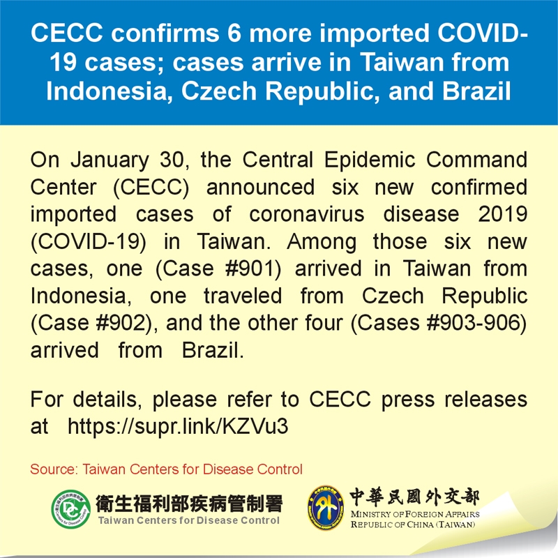 On January 30, the Central Epidemic Command Center (CECC) announced six new confirmed imported cases of coronavirus disease 2019 (COVID-19) in Taiwan. Among those six new cases, one (Case #901) arrived in Taiwan from Indonesia, one traveled from Czech Republic (Case #902), and the other four (Cases #903-906) arrived from Brazil.