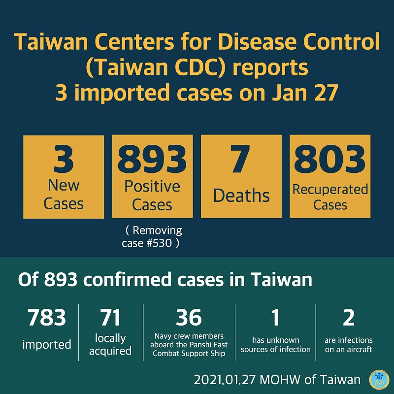 On January 27, the Central Epidemic Command Center (CECC) announced three new confirmed imported cases of coronavirus disease 2019 (COVID-19) in Taiwan. Those three new cases (Cases #892-894) arrived in Taiwan from the Philippines, Myanmar, and the United States.