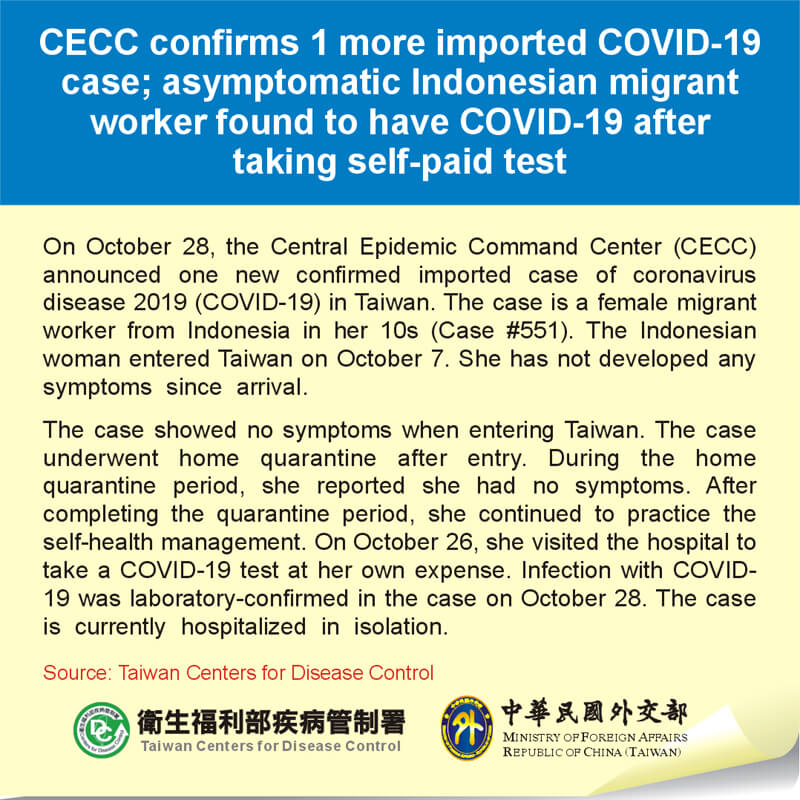 On October 28, the Central Epidemic Command Center (CECC) announced one new confirmed imported case of coronavirus disease 2019 (COVID-19) in Taiwan. The case is a female migrant worker from Indonesia in her 10s (Case #551). The Indonesian woman entered Taiwan on October 7. She has not developed any symptoms since arrival.