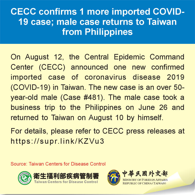On August 12, the Central Epidemic Command Center (CECC) announced one new confirmed imported case of coronavirus disease 2019 (COVID-19) in Taiwan. The new case is an over 50-year-old male (Case #481). The male case took a business trip to the Philippines on June 26 and returned to Taiwan on August 10 by himself.