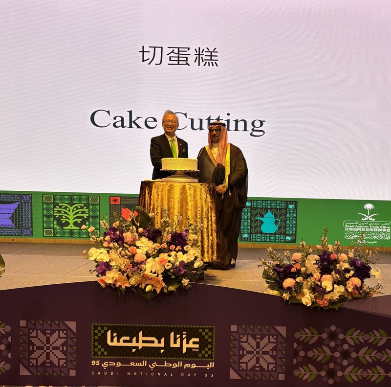 New Southbound Policy。Thứ trưởng Bộ Ngoại giao Ngô Chí Trung (bên trái) và Trưởng đại diện Văn phòng Thương mại Saudi Arabia – ông Mohammed S. A. Alghamdi cùng cắt bánh chúc mừng kỷ niệm lần thứ 95 Quốc khánh Vương quốc Saudi Arabia. (Ảnh: Bộ Ngoại giao)